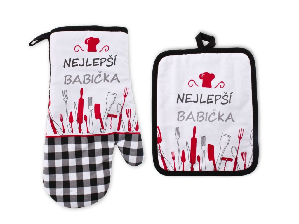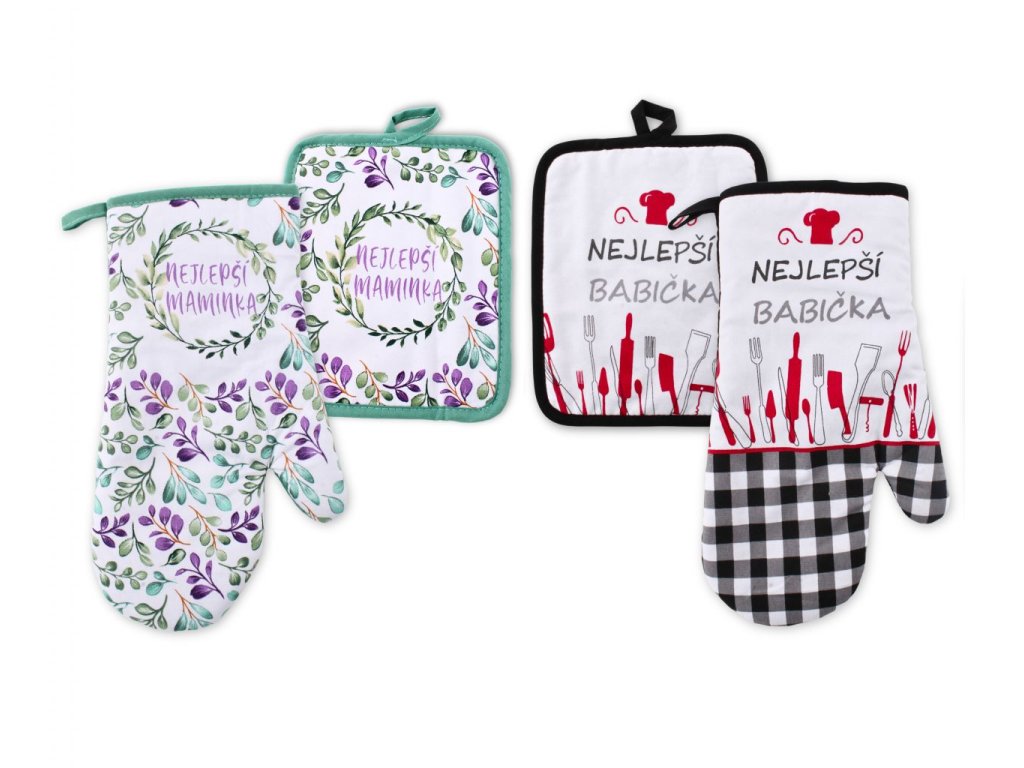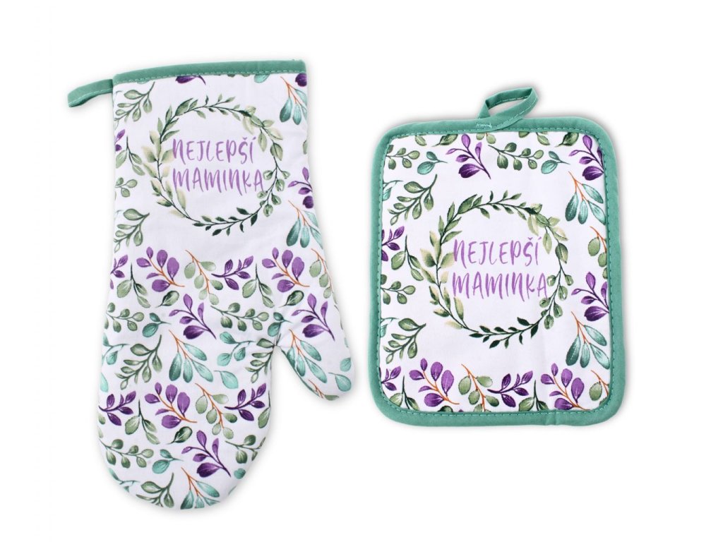 Kuchyňská sada obsahuje chňapku s magnetem a podložku pod hrnec. Rozměry: chňapka 18x30cm, podložka pod hrnec 17,8x20cm.