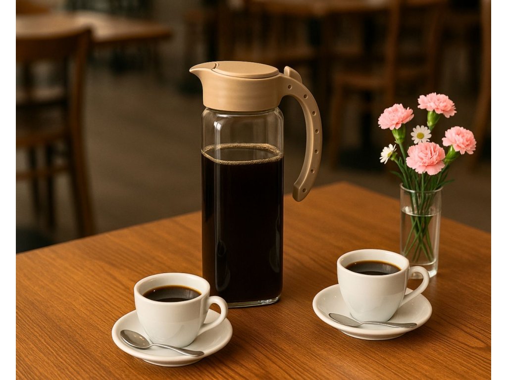 - Skleněný džbán vhodný do domácnosti na přípravu nápojů studených i teplých.