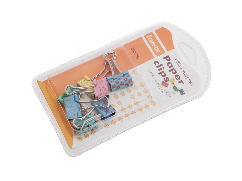 Balení kancelářských klipů z kovového matriálu. S veselými motivy květin a hvězdiček.