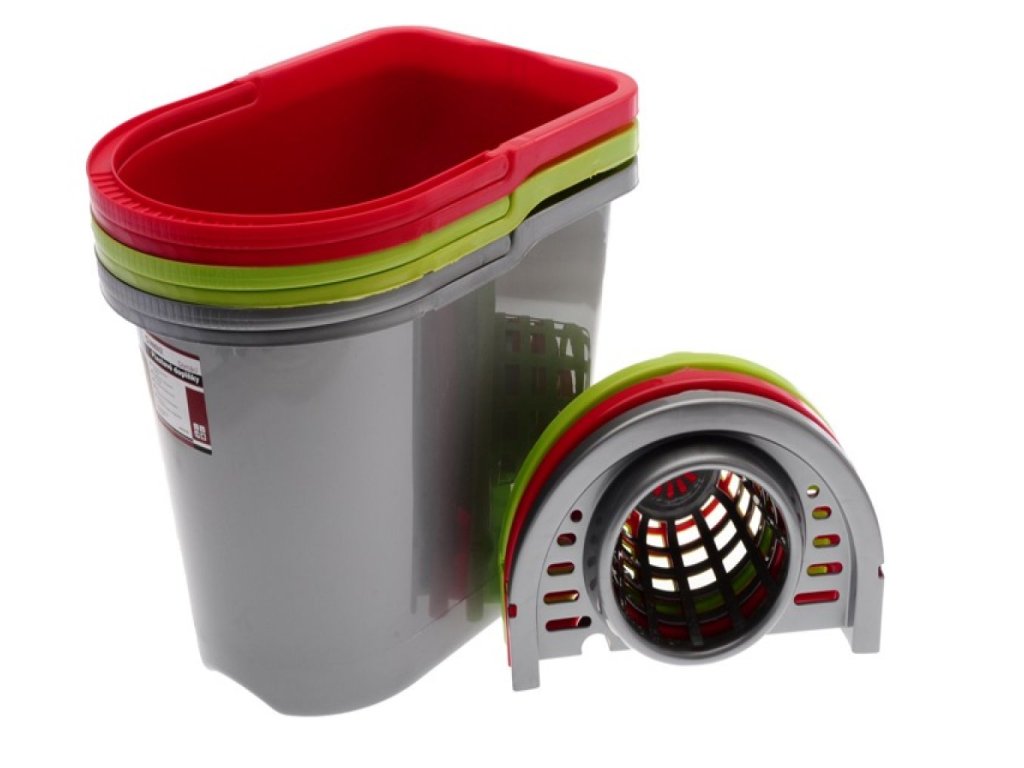- Vědro s výlevkou a ždímacím košem, vyrobené z pevného plastu.