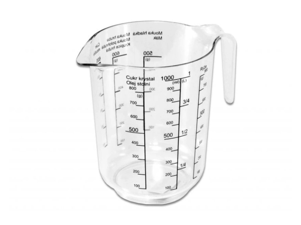 - Odměrka je opatřena stupnicí na mouku hrubou, polohrubou a hladkou, rýži, cukr moučku, cukr krystal, mák a olej.
