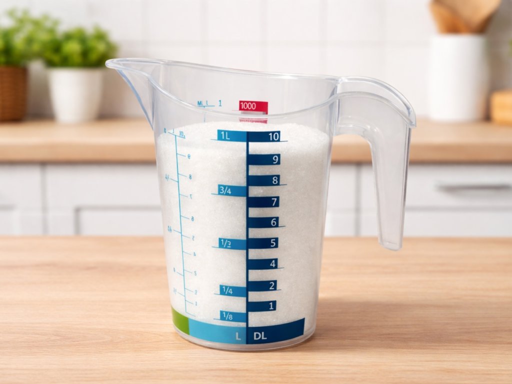 - Plastová odměrka o objemu 1l je vhodná pro odměřování sypkých i tekutých potravin díky přehledným stupnicím.