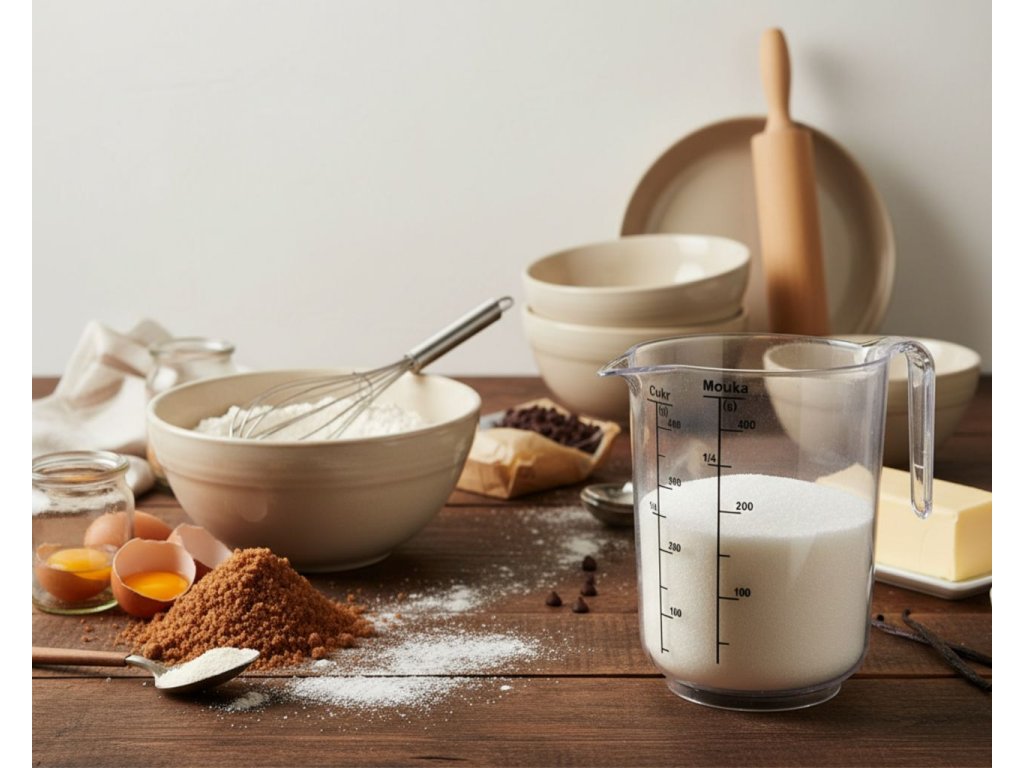 - Snadné odměřování sypkých i tekutých potravin díky přehledým stupnicím na odměrce.