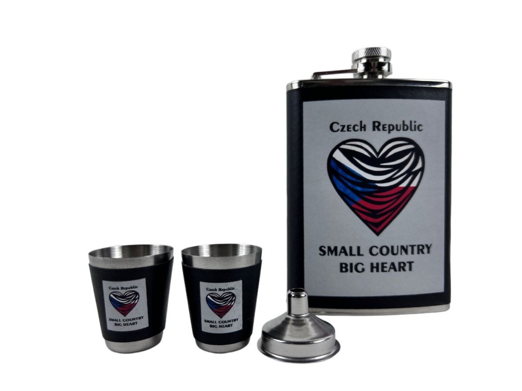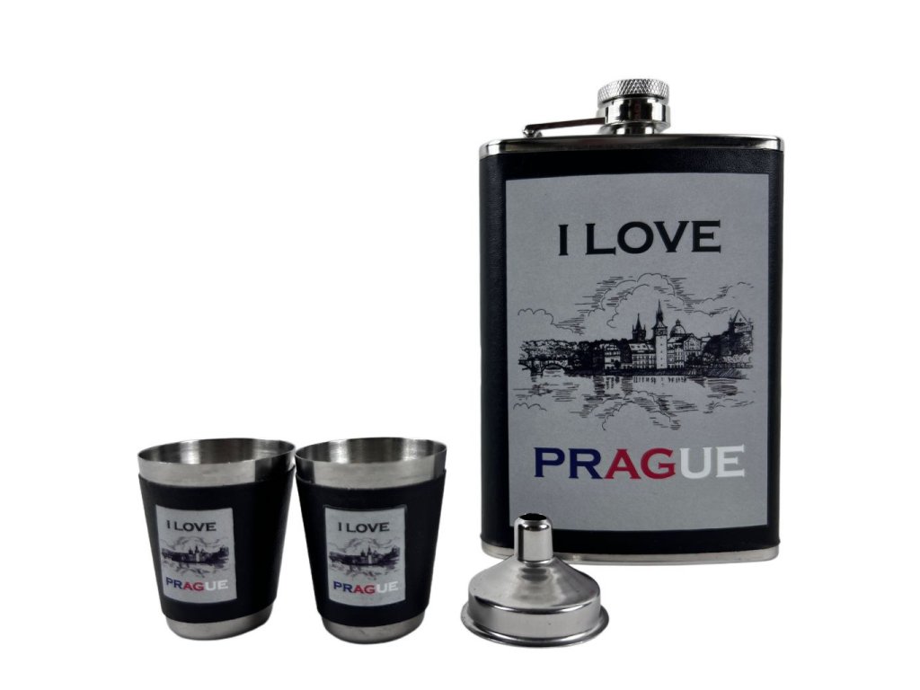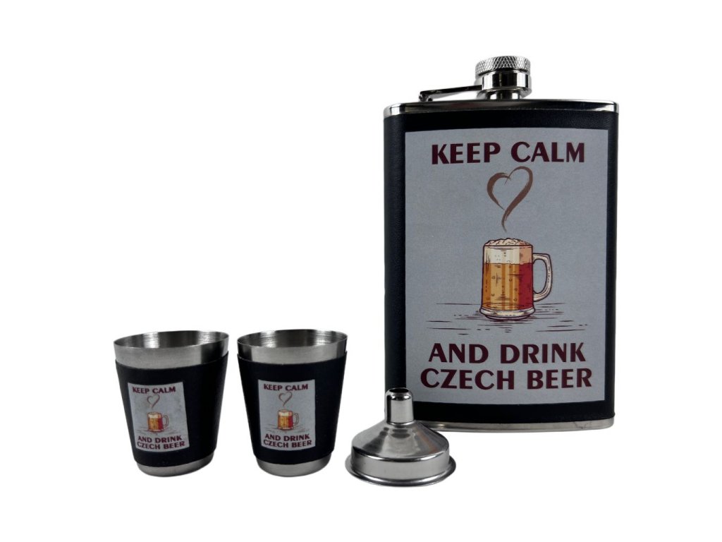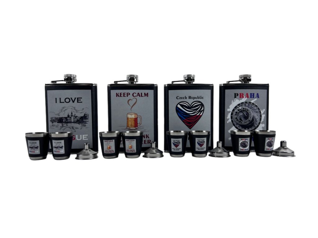 - Balení obsahuje: 1x placatka 240ml, 2x panák 30ml a 1x nálevku.