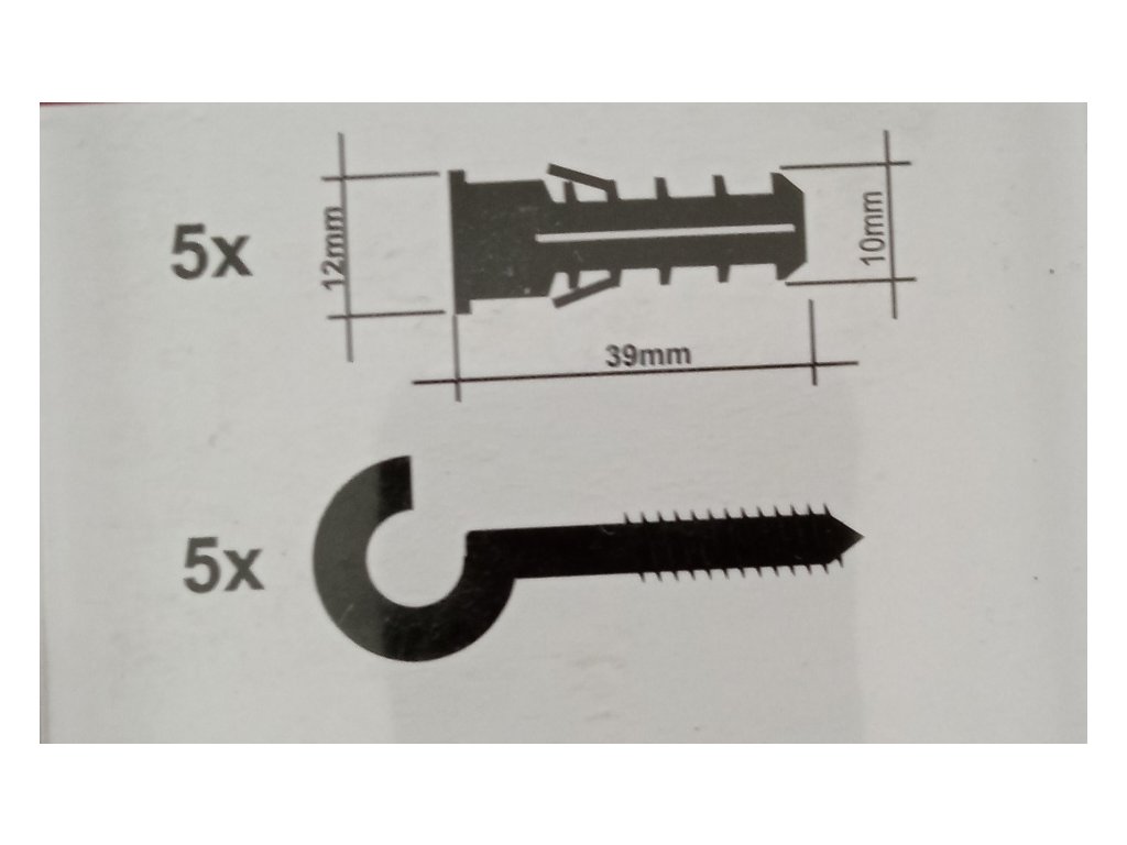 - V balení 10 kusů (5 háků a 5 hmoždinek)
