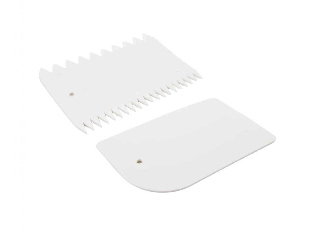 - Ruční pomůcka do kuchyně, dvoudílná sada stěrka, zdobítko, 1 s rovnými okraji, 1 se zoubky.