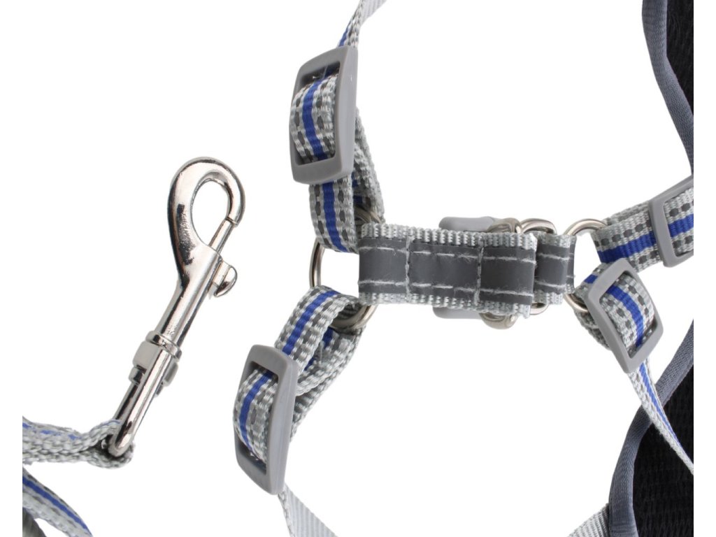 - Popruh je patřený kovovým kroužem, pro bezpečné uchycení vodítka.